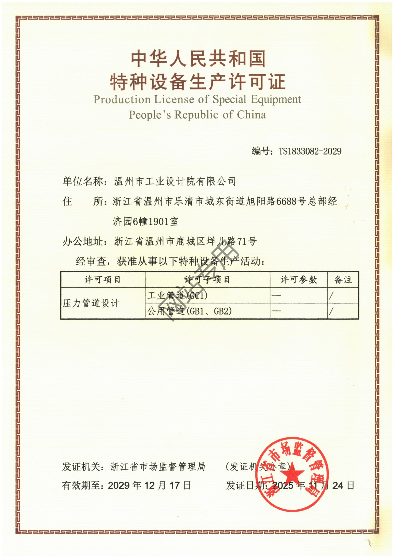 特種設(shè)備設(shè)計(jì)許可證壓力管道