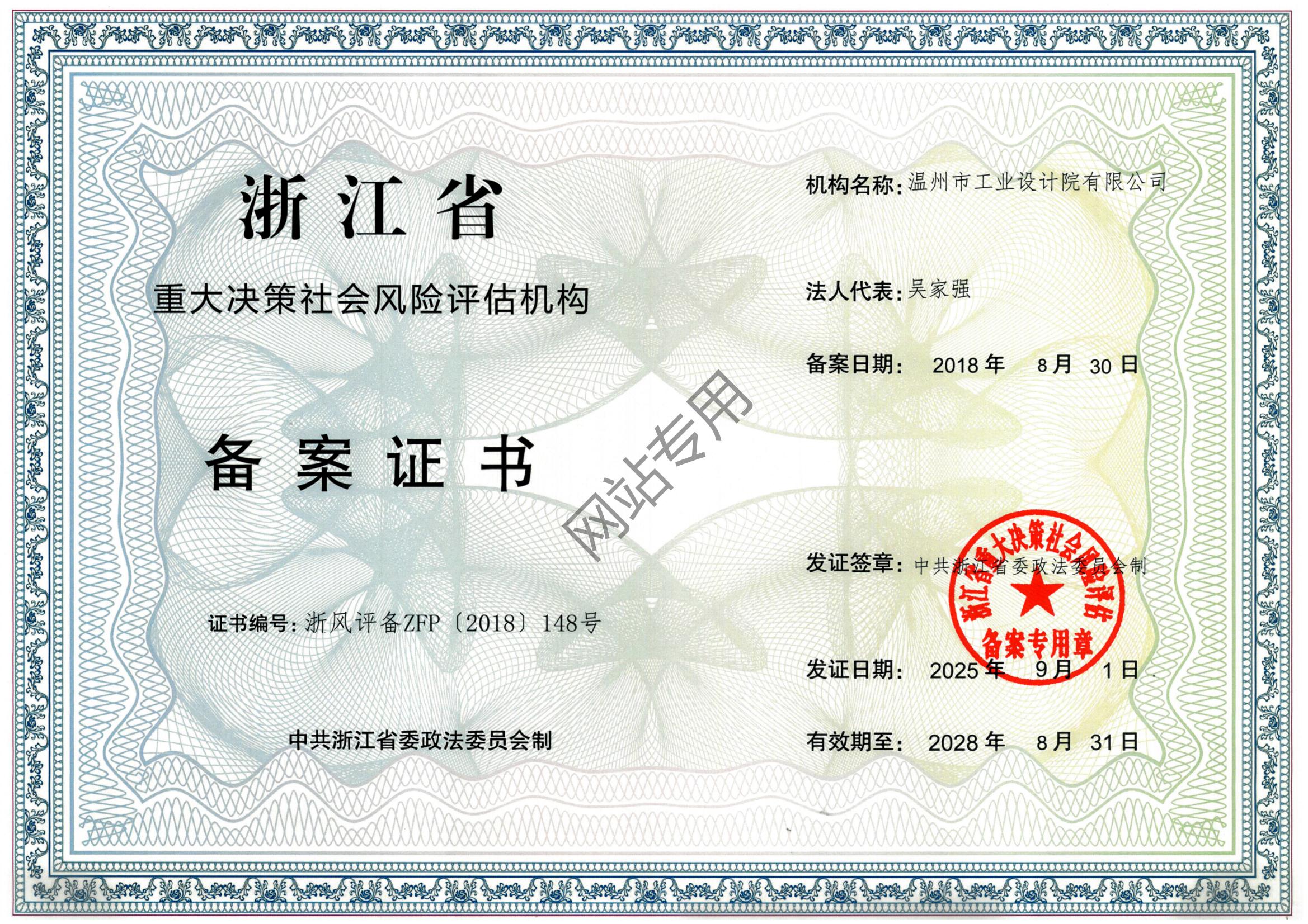 浙江省社會(huì)穩(wěn)定風(fēng)險(xiǎn)評估機(jī)構(gòu)備案證書
