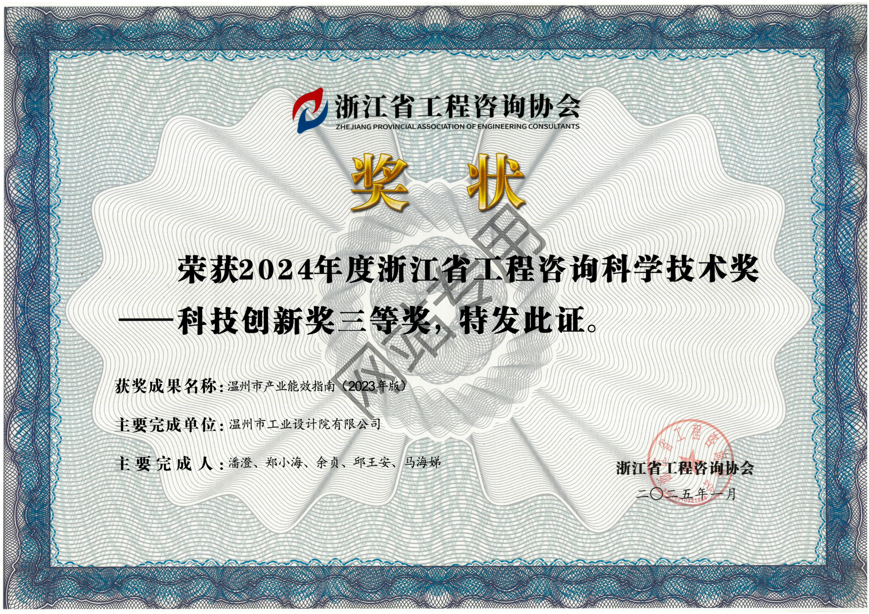 溫州市產(chǎn)業(yè)能效指南(2023年版)項(xiàng)目 2024年度省工程咨詢科學(xué)技術(shù)獎(jiǎng)—科技創(chuàng)新獎(jiǎng)獲獎(jiǎng)三等獎(jiǎng)