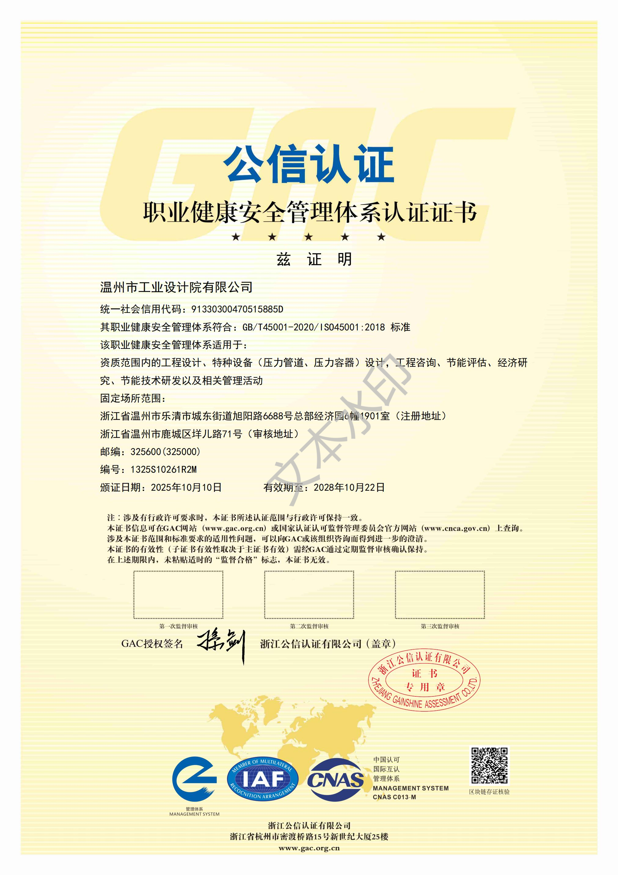 職業(yè)健康安全管理體系認證證書