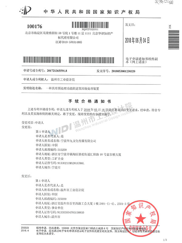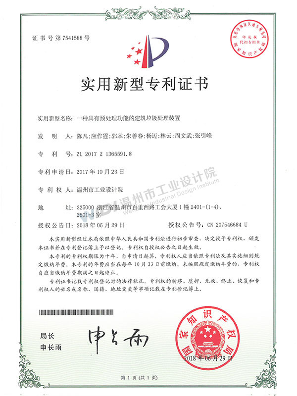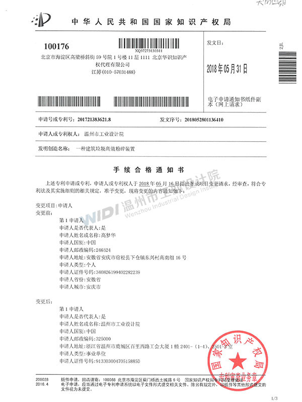 一種具有預(yù)處理功能的建筑垃圾處理裝置手續(xù)合格通知書 (1)