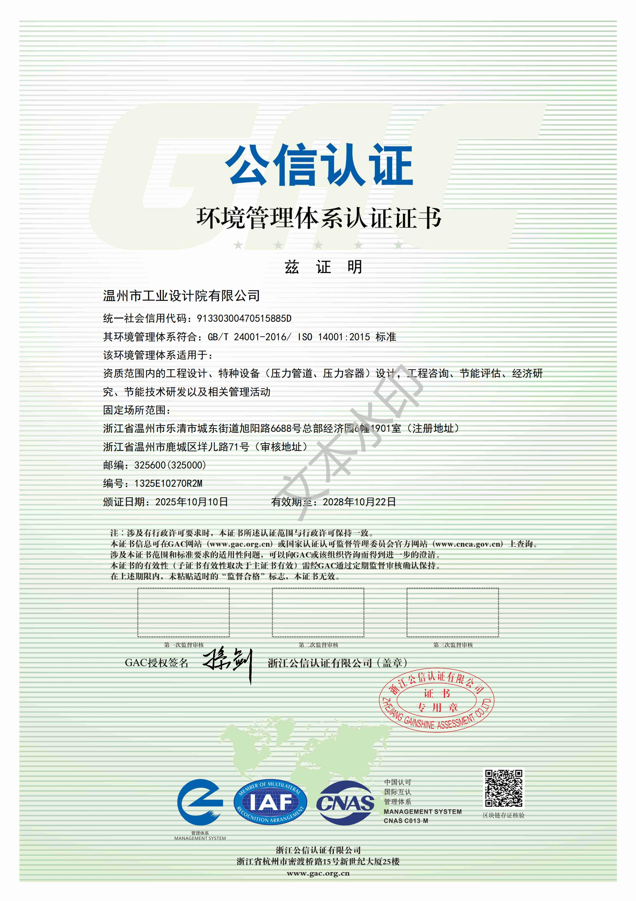 環(huán)境管理體系認證證書